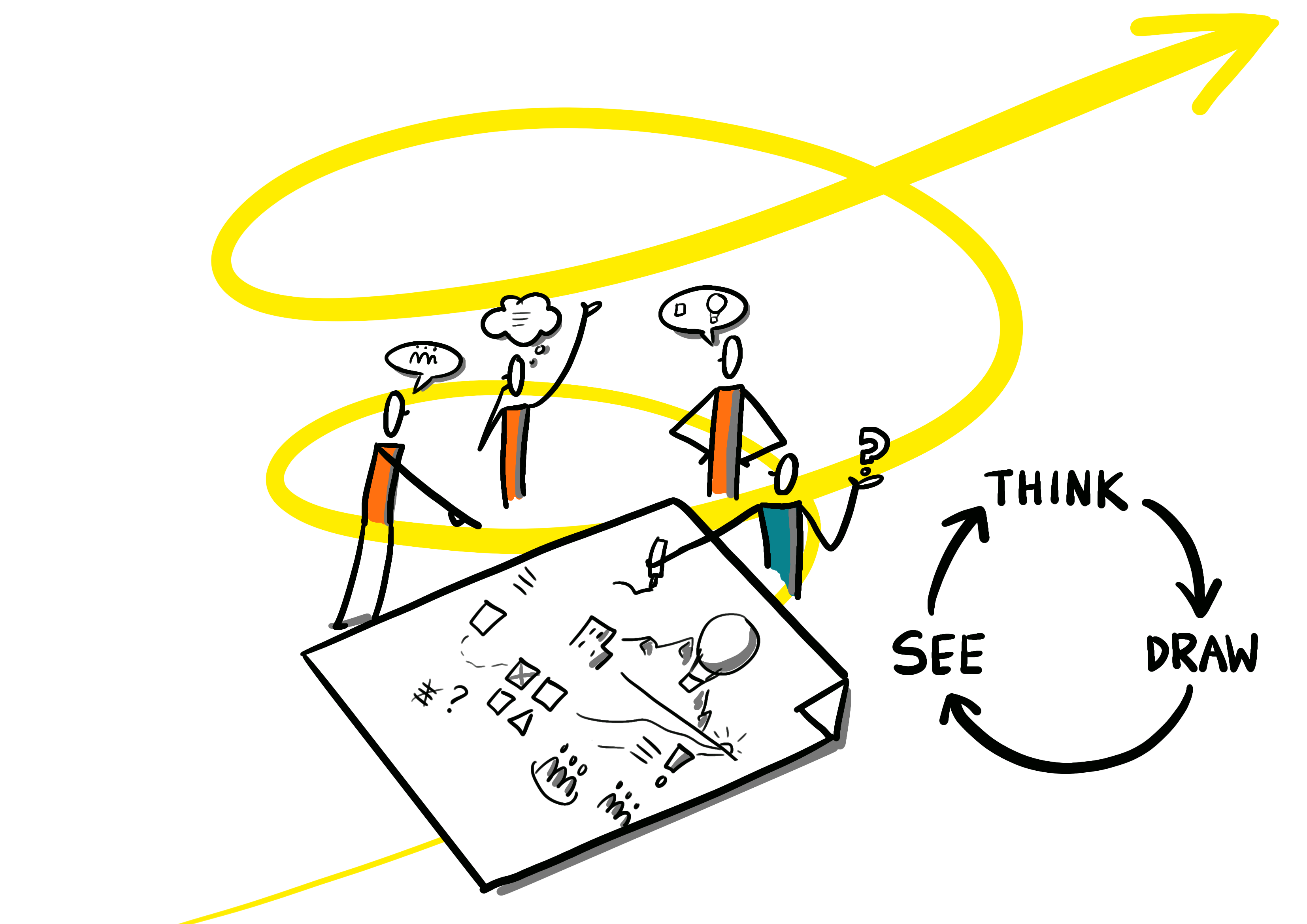 4. Verder denken, Hertekenen & aanvullen – De schets groeit mee met het denkproces. Nieuwe inzichten leiden tot verdieping. Informatie wordt herordend net zo lang tot dat helder is wat speelt, of wat het verhaal is. Er is een akkoord tussen de aanwezigen.